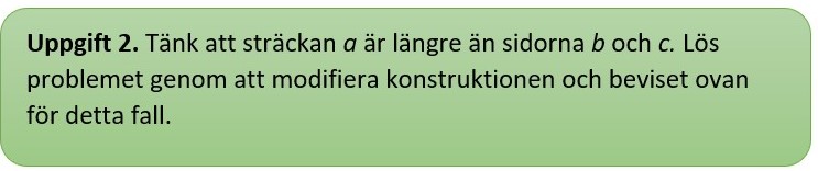 Avsätt sträckan a, som vi antar är kortare än c, på sträckan BC med början vid B. Låt E vara högra ändpunkten av sträckan a. Dra AE och förläng den tills den skär förlängningen av CD. Låt F vara denna skärningspunkt. Den sökta sträckan x är då DF.